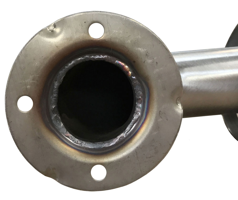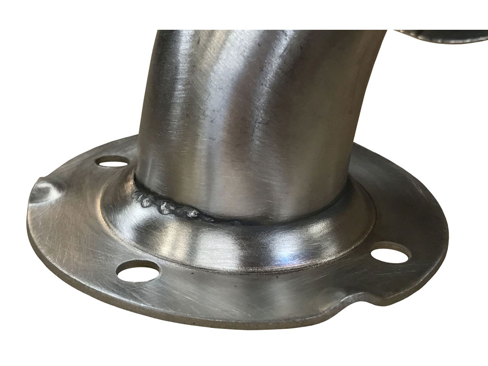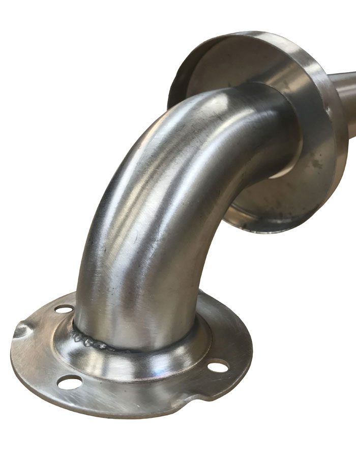 Fabricated of 3" diameter, #11 ga stainless steel with #4 satin finish to match tubing. Flanges are heliarc welded to bar to form a one piece construction. Each flange has three (3) mounting points (1/4" dia.)