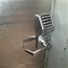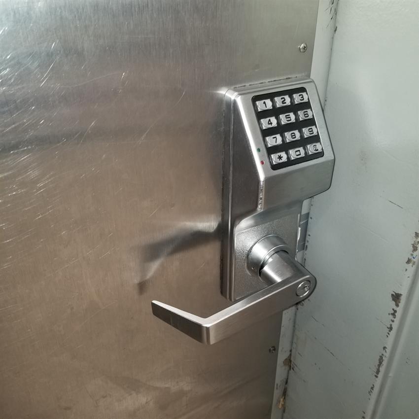Q: We’re looking for a restroom door lockset with a keypad and ability to lock from the interior. Our client wants to be able to give their customers the door code but keep transients out. This is a single-use restroom, so it needs to be such that locking from the interior overrides the number pad. Do you have anything available? Satin chrome (or similar) finish with ADA-compliance…