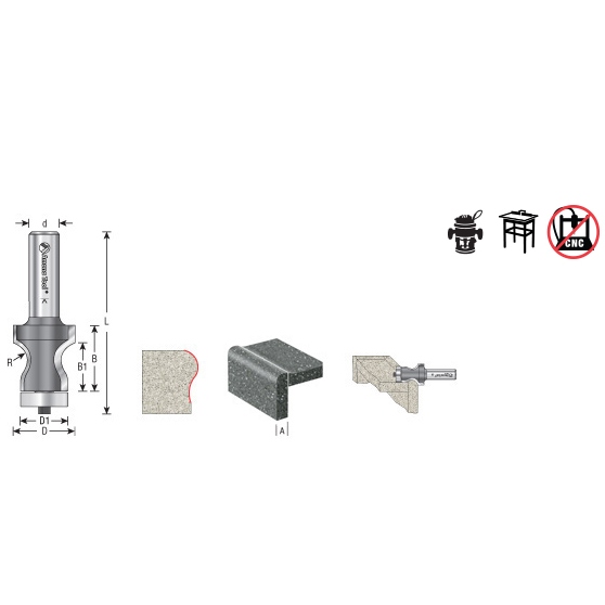 Cuts a 'no-drip' edge in one pass, on kitchen and vanity countertops