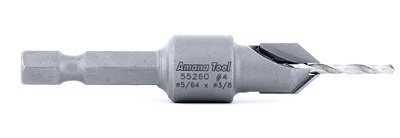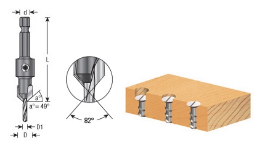 Drill pilot hole and tapered countersink for wood screws. The 2-flute integral design ensures uniform concentric results each and every time. Carbide tipped for long lasting results in hardwood, plywood, plastics, etc.
