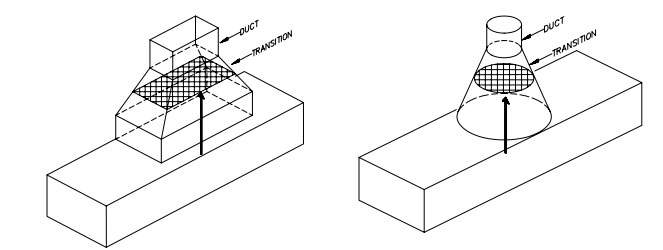 The Amerex duct nozzle (P/N 16416) is listed to protect restaurant cooking ducts of unlimited length up to 50 perimeter inches (127 cm) or 16 diameter inches (40.6 cm) using one nozzle. The nozzle has one flow point and must be centered within the duct, placed 2 – 8 inches (5.08 – 20.32 cm) into the duct opening and aimed at the center of the cross section of the duct.