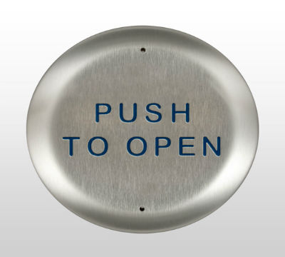 BEA 10PBR45 4 1/2" Round Stainless Push Plate, Blue "Push to Open" Text