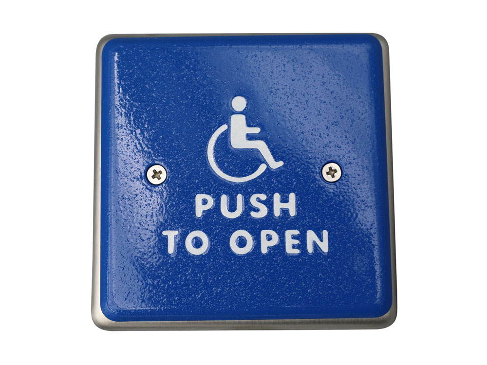 • Square 4.5" Blue Stainless Push Plate, White Handicap Logo and White "Push to Open" Text