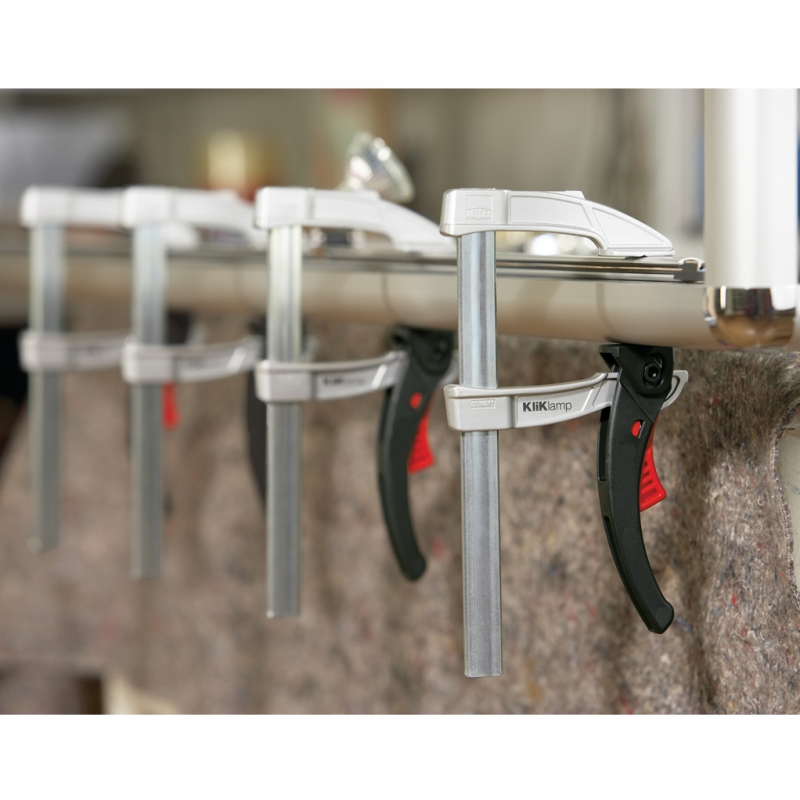 Innovative, high-tech, KliKlamp® lever clamp is extremely lightweight, the smallest weighs a tiny 0.53 lb Ideal for assembly work or where several clamps are used at once. Pressure builds easily - ratchet mechanism can achieve a huge 260 lb of clamping force quickly - with just 2 fingers. Quick, easy & gentle!