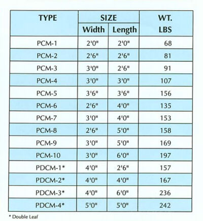 Type PCM single leaf access doors incorporate several innovative features which reduce the amount of labor required to cast the door into a concrete vault. Doors are constructed of aluminum. Size: 36"W x 48"L.