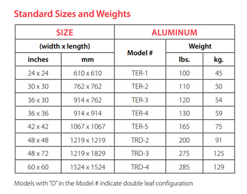 Size: 48" x 48"; Double Leaf; NOTE: Type TRD Doors are designed with a 1" (25 mm) Pan Cover to accept a variety of flooring materials. Sizes are limited & dependent upon weight of fill material.