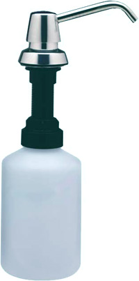 Press piston down to dispense commercially marketed all purpose hand soaps. Vandal-resistant spout can rotate 360 degrees without damage to unit. Escutcheon locks to body with concealed locking mechanism that is opened with special key provided. To fill from top, unlock cover and remove piston, spout, and supply-tube assembly. Unit may also be filled by removing container from below lavatory. Designers Note: Bobrick liquid soap dispensers are designed to dispense commercially marketed all purpose hand soaps including liquid and lotion soaps, synthetic detergents, and antibacterial soaps containing PCMX and/or Triclosan.