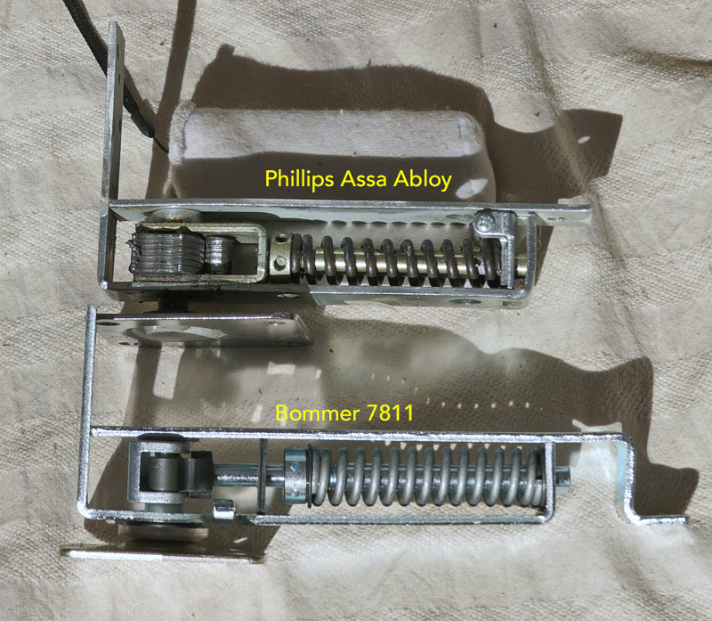 Q: The photos show clearly the failed pivot spring hinge. A brand not familiar to me and quite cheaply made; the Bommer is single piece hardened steel, as far as I can tell. (I have never seen an original Bommer fail, though I have adjusted and re-greased a few units.) The install was smooth with only a minor modification to the cut on the bottom edge of the door and proper edge roundovers on the door. The Bommer trim assembly has prominent shoulders, which is a minor design flaw. The gap between door and jamb needs to be closer to 1/4 inch, wider than I anticipated. So, thanks for shipping this. Images attached.