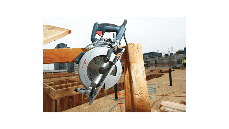Built-In Saw Hook — Allows convenient saw storage between cuts