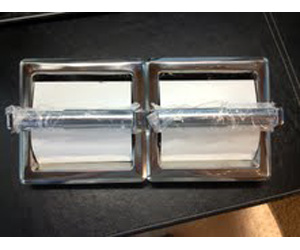 Recessed dual roll toilet tissue dispenser with hinged hood shall be heavy gauge stainless steel and hold two standard core toilet tissue rolls.