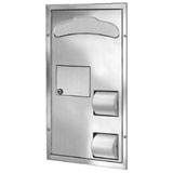 Partition mounted combination unit shall include toilet seat cover dispenser, toilet tissue dispenser, and napkin disposal, and be fabricated of type 304 (18-8), heavy gauge stainless steel with seamless exposed surfaces in satin finish. Door and back panel shall be 18 gauge. Door shall have piano hinge and tumbler lock. Fixed flange shall provide for flush mounting on one side for grab bar installation.
