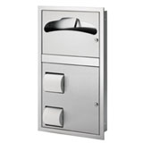 Recessed combination unit shall include toilet seat cover dispenser and toilet tissue dispenser, and be fabricated of type 304 (18-8), heavy gauge stainless steel with seamless exposed surfaces in satin finish. Door and back panel shall be 18 gauge. Door shall have piano hinge and tumbler lock.