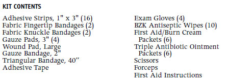 The 10-person FIRST AID KIT comes in a weatherproof plastic case with an easy carry handle for simple transport.