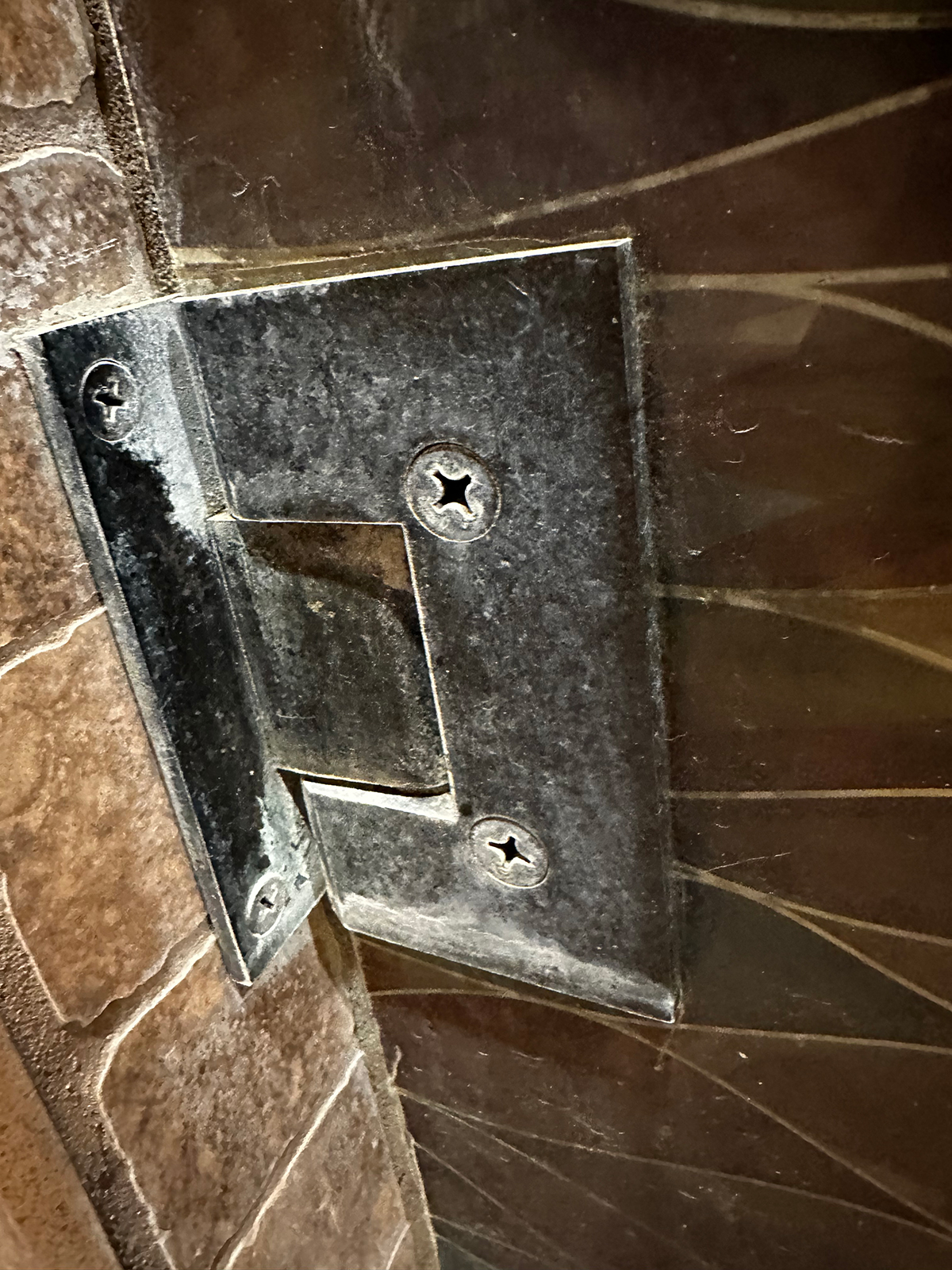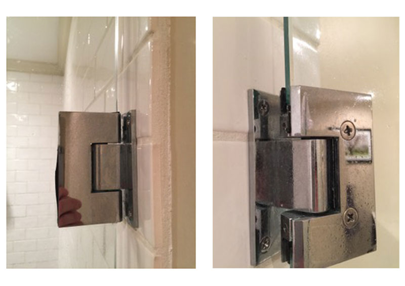 Two strategically placed steel pins inside the hinge provide template options, and satisfy two schools of thought for mounting shower door hinges. For the safety of "mouse-ears" type cut-outs, the two steel pins should be left in place