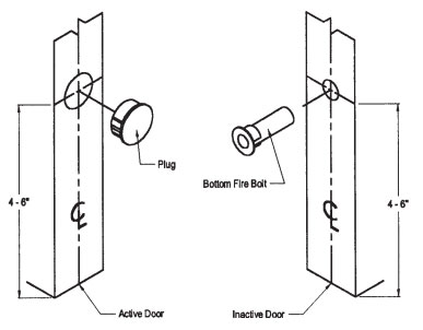 The 860/960 is installed in the top of inactive door. Opening active door automatically retracts the top bolt. Closing the active door automatically extends the top bolt into the frame strike, locking inactive door. The BFB is installed horizontally in the bottom of inactive door with a mating hole in edge of active door. When subjected to 230°F the BFB projects a bolt, locking leaves together.