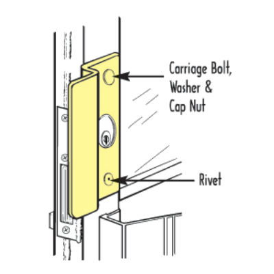 2-5/8" x 6-1/2" x 1-1/8" duro coated latch guard for use with center hung outswing aluminum doors.