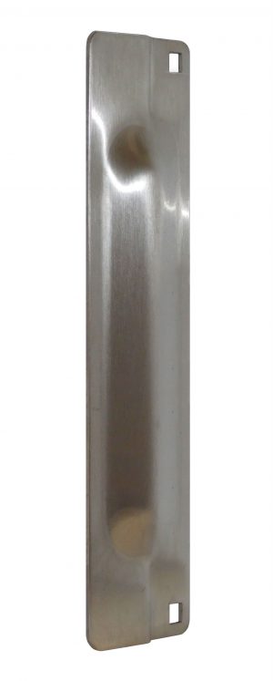 3" x 11" satin stainless steel latch guard for outswinging doors. Completely covers the strike plate.