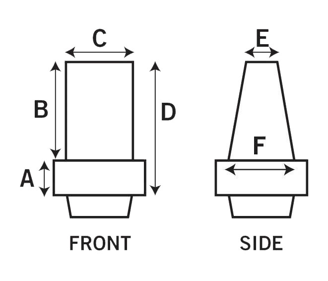 Sizes: A = 25 mm B = 14 mm C = 21.5 mm D = 42 mm E = 10.5 mm F = 12 mm