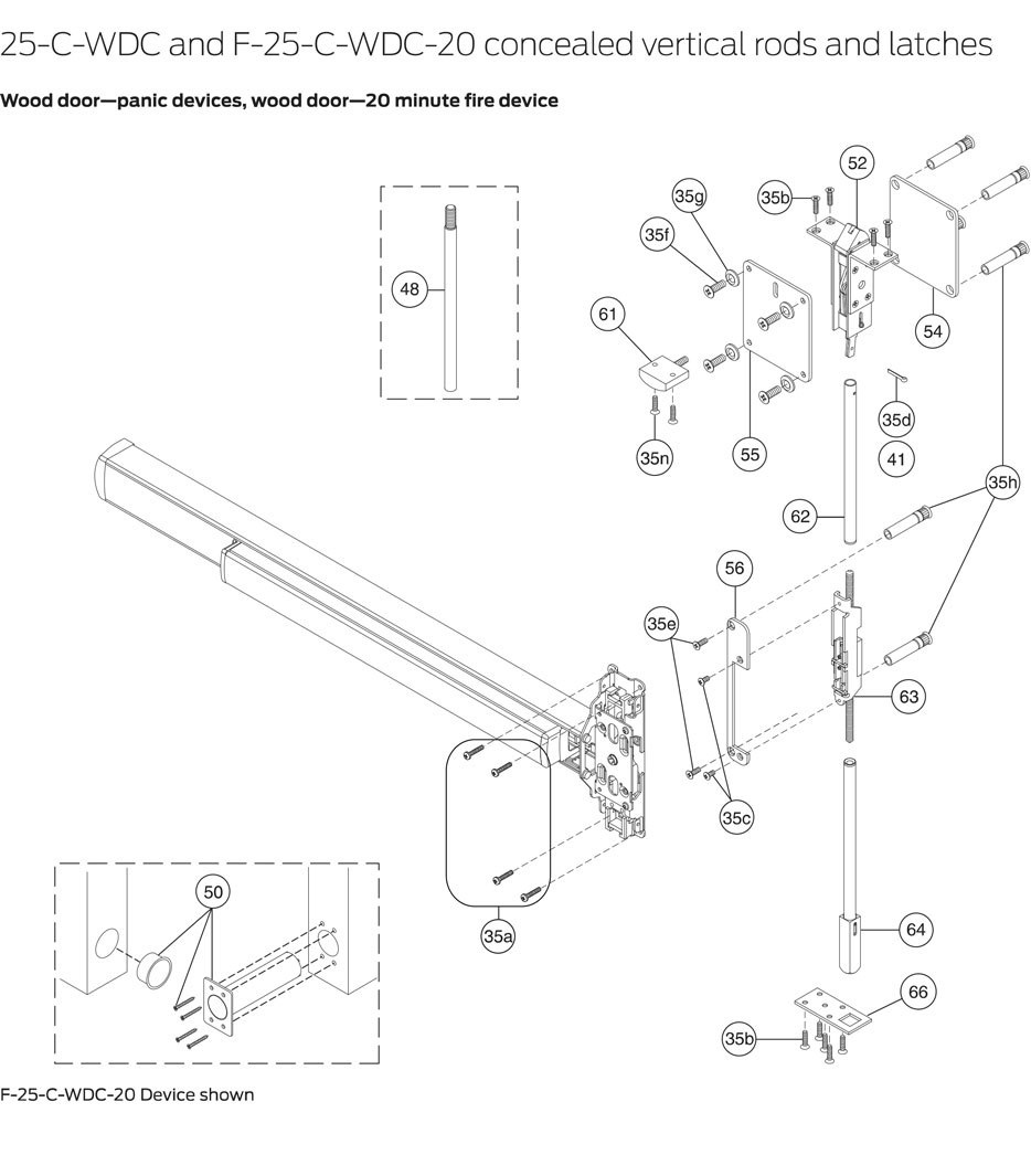 Package content for 25-C-WDC and F-25-C-WDC-20 concealed vertical rods and latches Wood door—panic devices, wood door—20 minute fire device (part # 35):