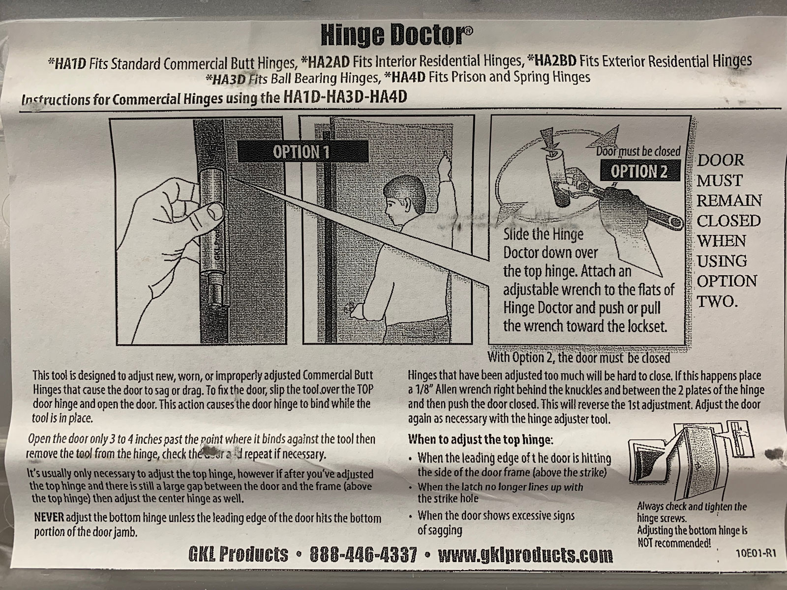 Includes all of the Commercial Hinge Doctor Sizes long with the HA2 for Residential Applications
