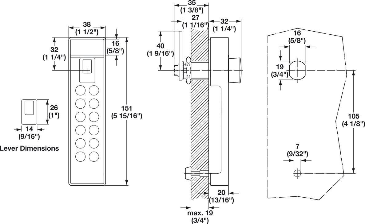 Hafele 231.98.005 Keypad Lock, Safe-O-Tronic LS100, Vertical, With Lever At Top, Aluminum/Plastic/Steel, White/Gray