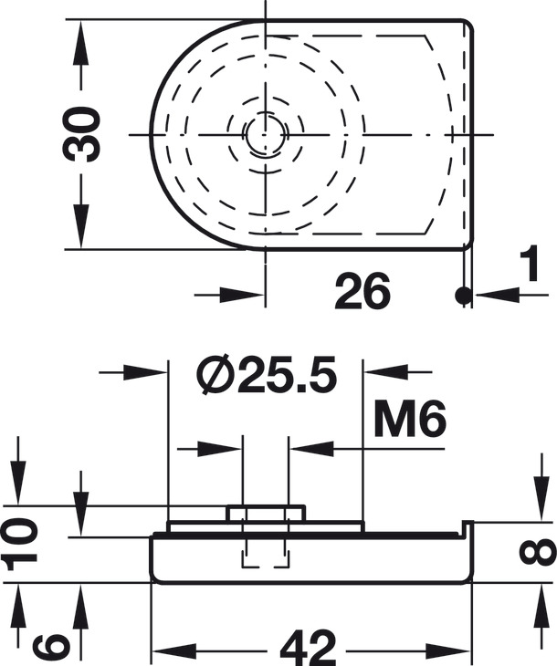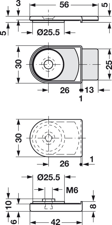 1 Threaded screw M6 x 10 mm (3/8") (for glass thickness up to 8 mm (5/16"))