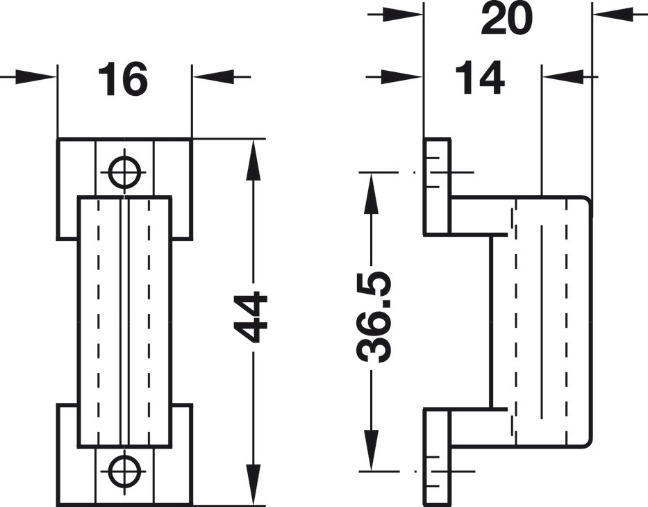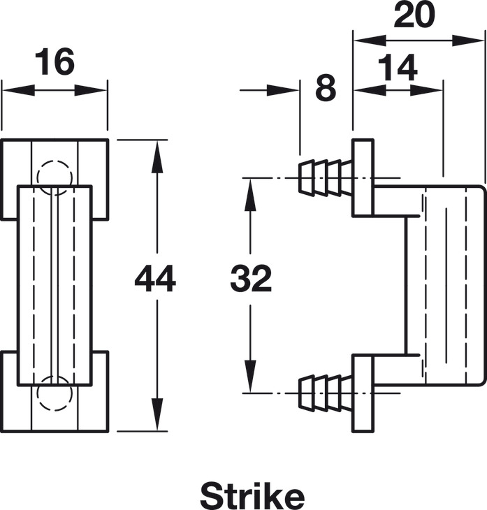 Hafele 245.07.784 Strike, Dowel Mount, Use #4 Pan Head Screw, 1 1/4", Polyamide, White