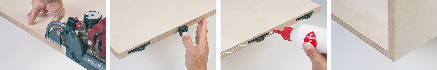 Notes: The connector must always be used with glue. The connection cannot be separated after engagement. Lengthwise and system groove required. The Lamello Zeta P2 biscuit joiner or CNC machine required for installation.