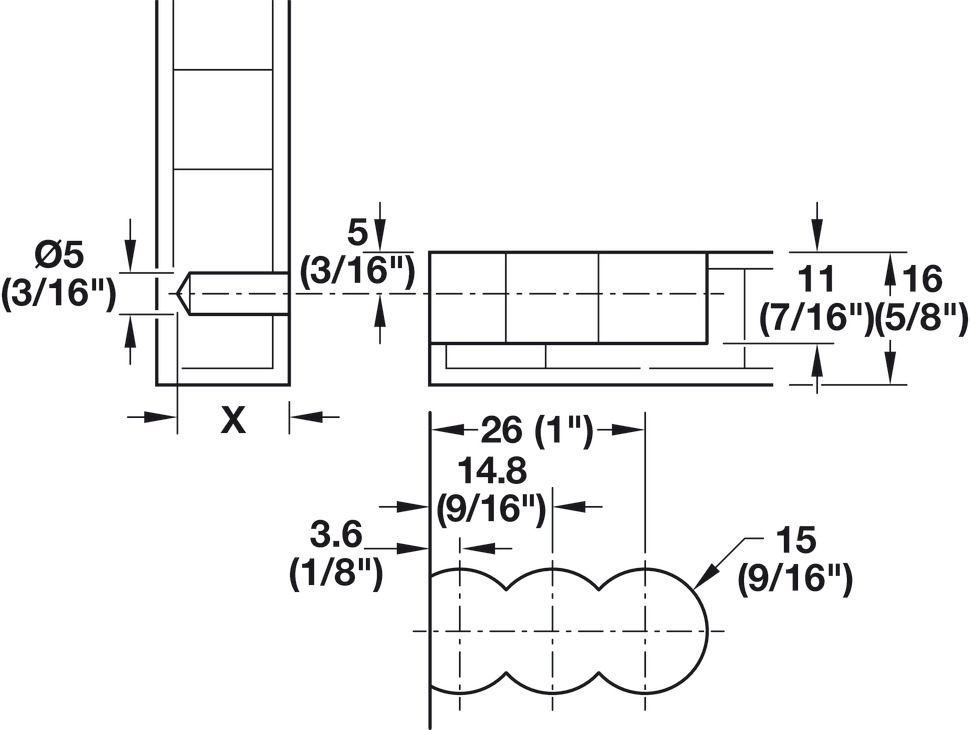 Installation: Press-fits into base panel and screw mounts into side panel with Ø5 mm drill hole