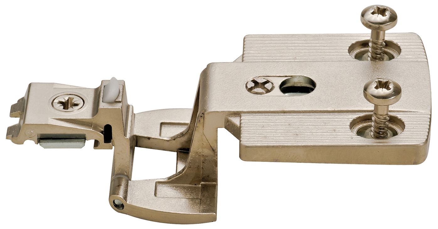Hinge arm component available with pre-installed expanding dowels for 5 mm holes, or for screw attachment
