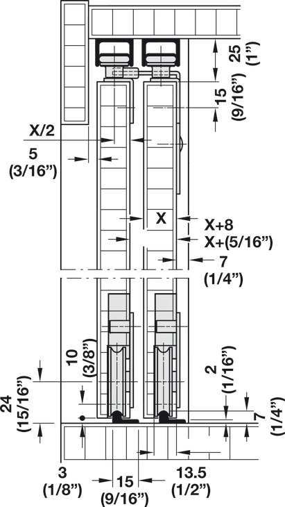 Hafele 402.23.001 Sliding Door Hardware, Slido F-Line15 55A, for Bottom Running Wood Doors, for Door Weights up to 121 lbs., for 3 Doors, without Height Adjustment, Plastic/Steel, Per Set