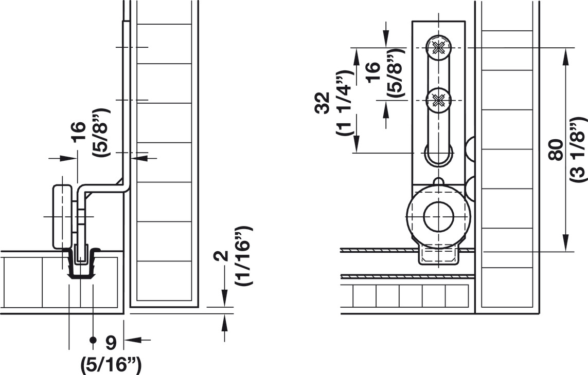 Hafele 402.27.001 Sliding Door Hardware, Häfele Slido F-Line19 20A, for Bottom Running, Wood Sliding Door, for Door Weights up to 44 lbs, Overlay Mounting, for 1 Door, Cranked Running Gear, Vorfront, Steel, Per Set