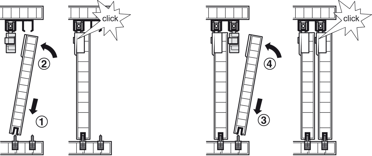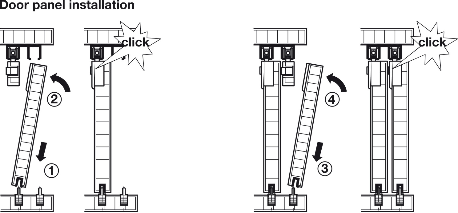 Door stopper: Top clip-in door stopper or as soft and self closing mechanism, for sliding into running track