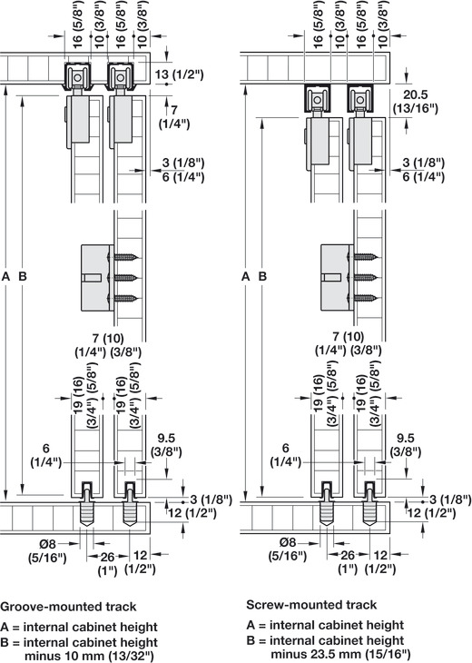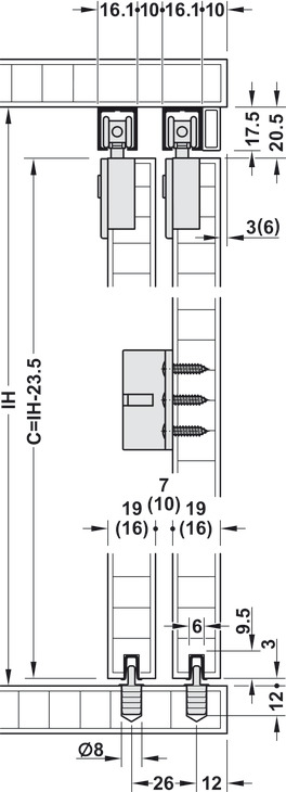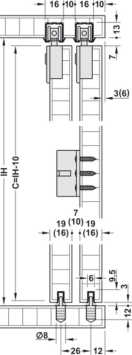 Hafele 402.33.026 Sliding Door Hardware, Slido F-Line21 40C, 88 lbs Weight Capacity, For 2 Doors, With Clip-in Door Stopper, Plastic/Zinc Alloy/Steel, 1 Set