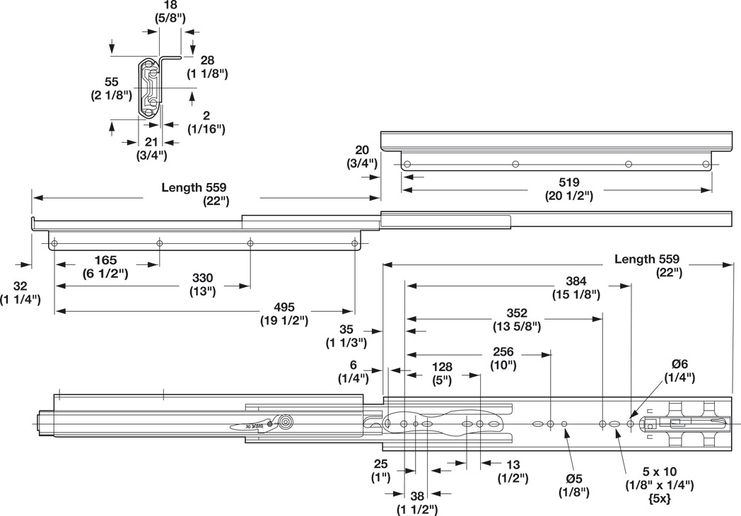 Hafele 420.86.967 Accuride 3600-200, Top/Bottom Mounted Slide, 22" Installation Length, 175 lbs Weight Capacity, Steel, Zinc, 1 Pair