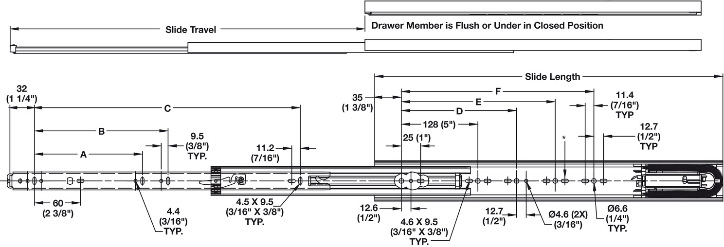 Outer member hole pattern matches models 3832/3834. The same hole configuration and fastener type are used whether slides are going into a 1/2" or 3/4" side space.