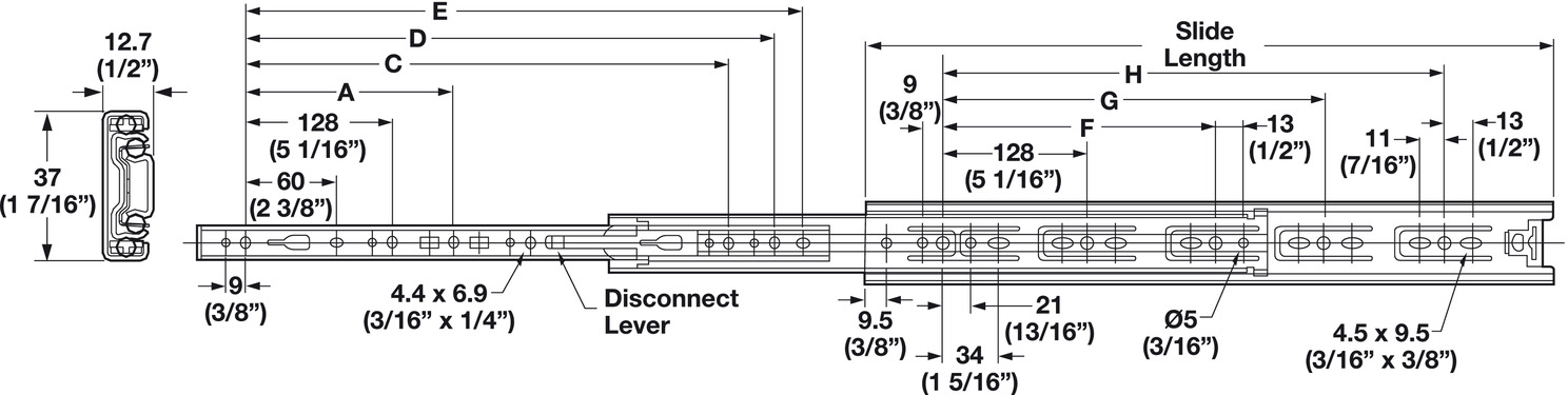 Hafele 422.88.957 Slide, Accuride 3732, Ball Bearing, 22" Extension Length, Steel, Zinc, Box of 10 Pairs