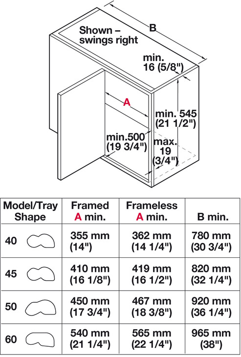 Frameless A min: 16-1/2" (419 mm) (please check on the picture below)