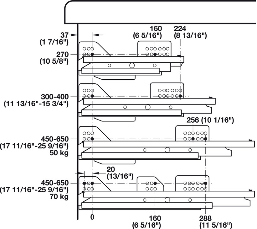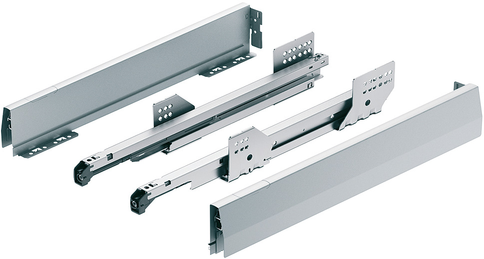 - Supplied with: 1 left and 1 right drawer slide, 1 left and 1 right cabinet profile, 2 cover caps, Pre-attached back brackets