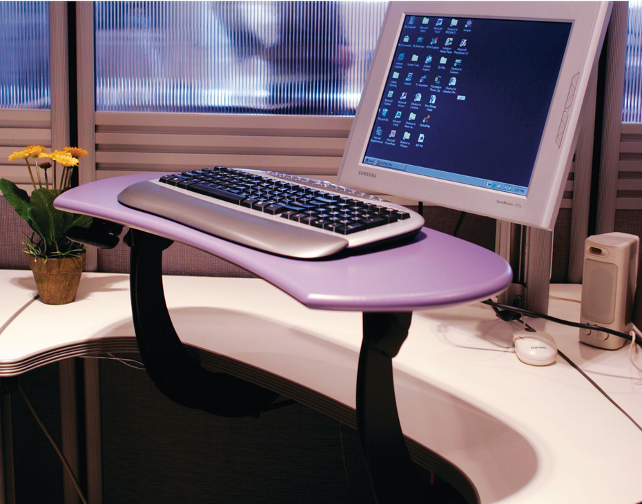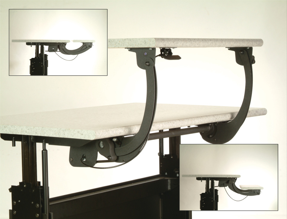 This revolutionary product with its sleek design permits the addition of a fully adjustable secondary work surface to most fixed or height adjustable tables