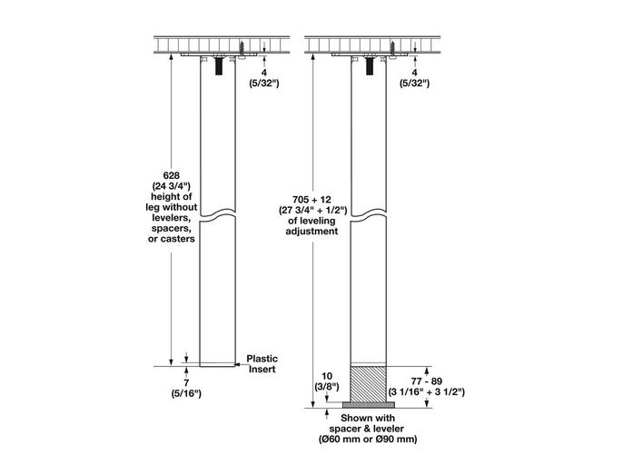 Spacer plus optional levelers = 77mm, same height as optional caster