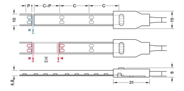 Maximum wattage-dependent strip length on the driver, see technical data for LED strip lights.
