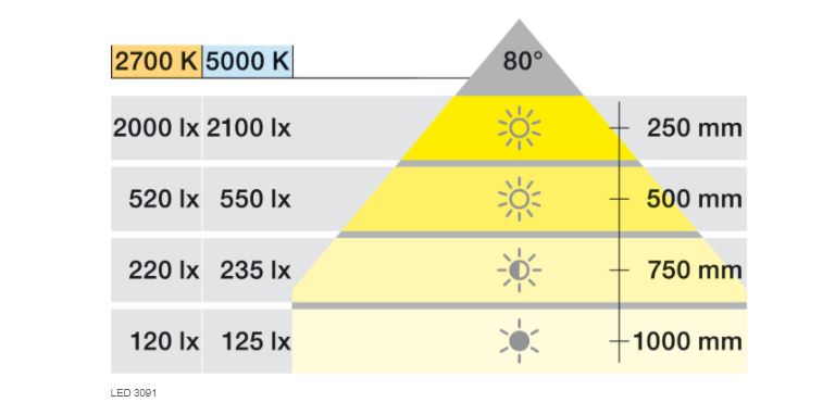 - Luminous efficacy (Lm/W): warm White: 72 lm, cool white: 80 Lm/W