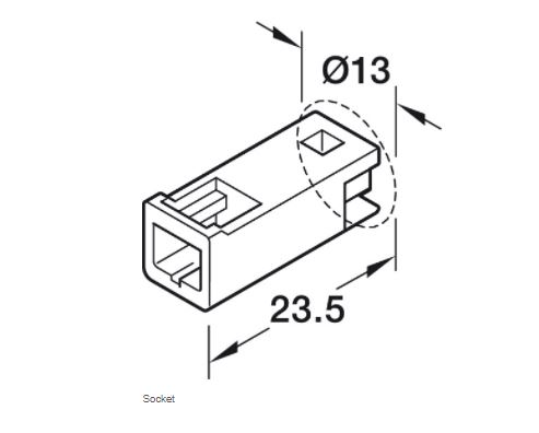 Drill hole diameter: plug 8 mm (5/16"); socket 13 mm (1/2")
