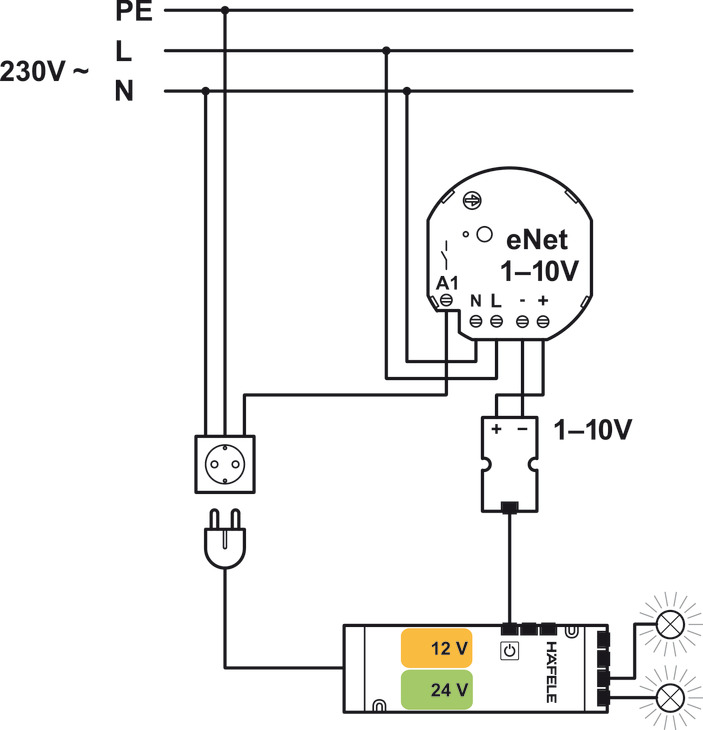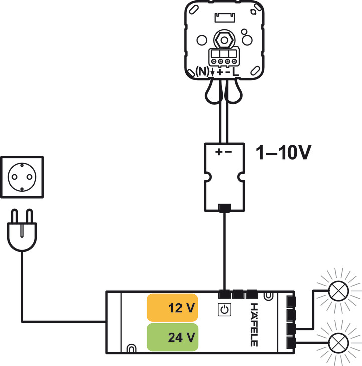 Additional information: Use dimmer only, if monochrome lights are connected. Not suitable for the connection of converters or control devices. Direct connection to a normal household dimmer with a 0-10 V control output and connection via a lead with snap-in connector for modular switches to the switching input of a 12 V or 24 V Loox driver or a distributor.