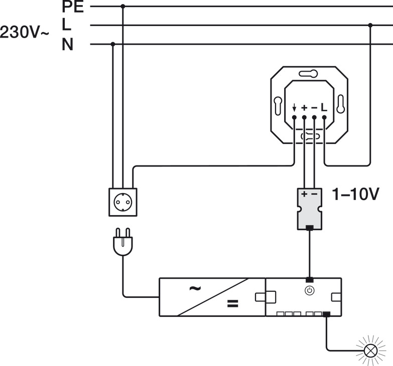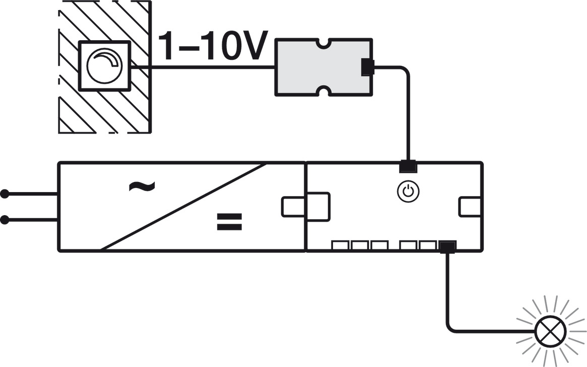 Application: For dimming lights at a Loox driver 12 V or 24 V using wall dimmer with on/off function and control output 1-10 V