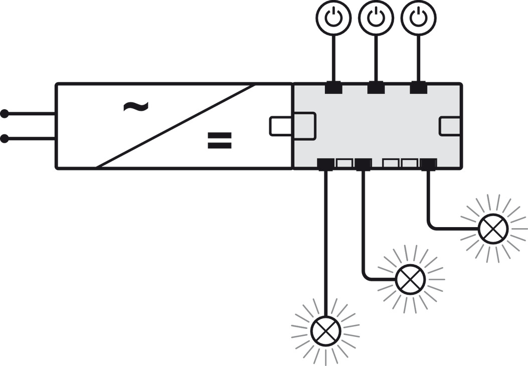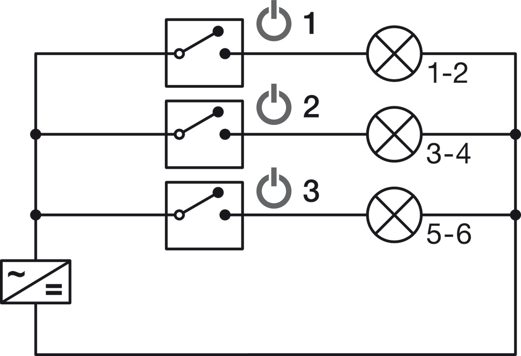 Operate one switch (1, 2 or 3) to switch all outputs on/off.