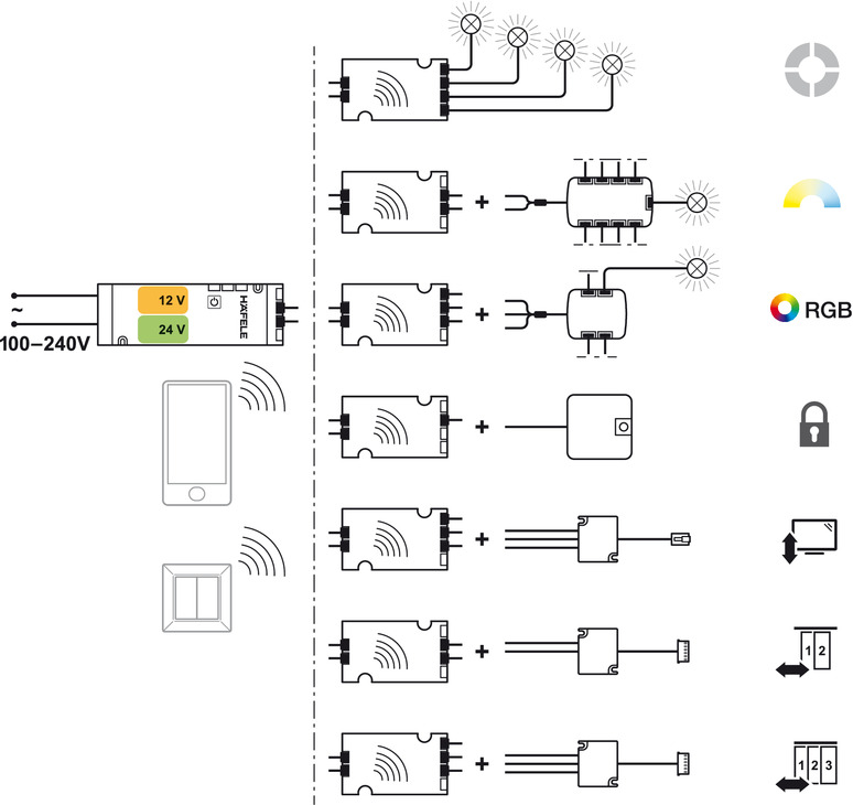 All BLE boxes are supplied in default white light mode. For multi-white and RGB lighting applications, it is required to change the operating mode through "Change profile" in the Hafele Connect app. Please refer to the Hafele Connect App user guide or Quick guide for instructions.