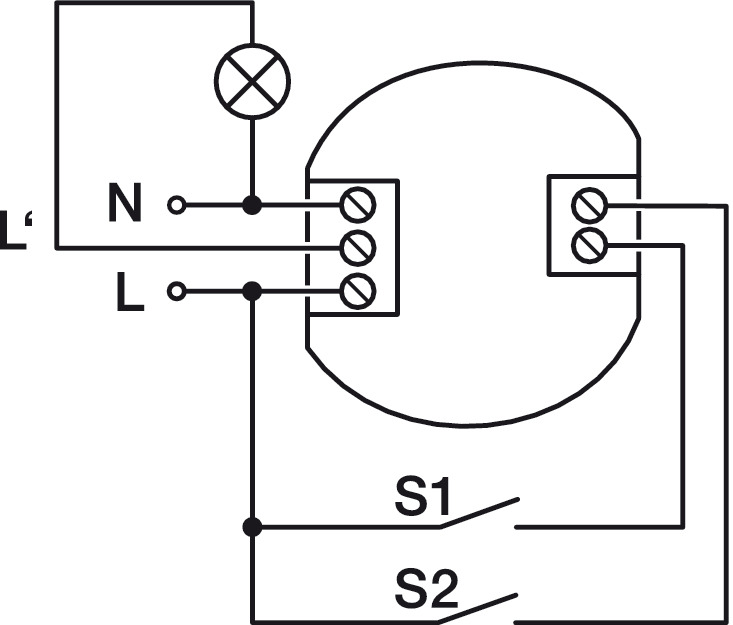 Number of connections: 2 switching input port for conventional wall-mounted toggles switches (double-throw), 1 output port for on/off switching of 80–230 V, 3 A (can be controlled from any active component of the network)