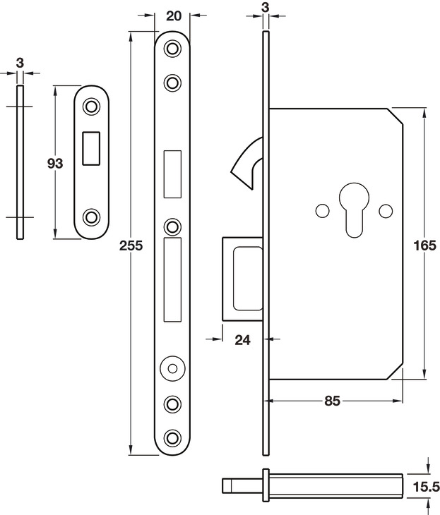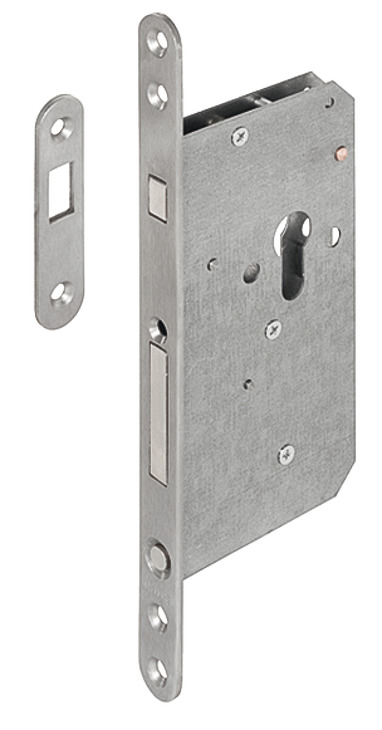 Hafele 911.26.350 Mortise Lock, For Sliding Doors, For Residential Areas, With Compass Bolt, Profile Cylinder, Stainless Steel, Matt Plates